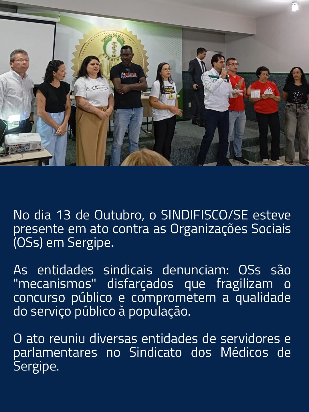 No último dia 13 de outubro, a diretoria do Sindicato do Fisco de Sergipe (SINDIFISCO/SE) participou de um ato contra as Organizações Sociais (OSs) no serviço público em Sergipe.