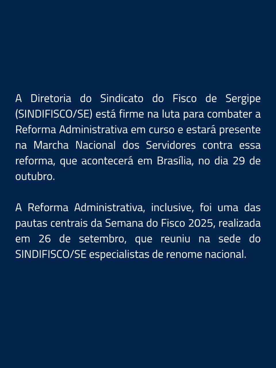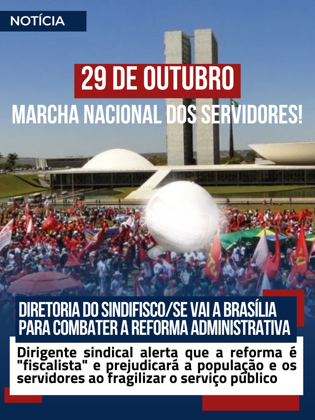 A Diretoria do Sindicato do Fisco de Sergipe (SINDIFISCO/SE) está firme na luta para combater a Reforma Administrativa em curso e estará presente na Marcha Nacional dos Servidores contra essa reforma, que acontecerá em Brasília, no dia 29 de outubro.