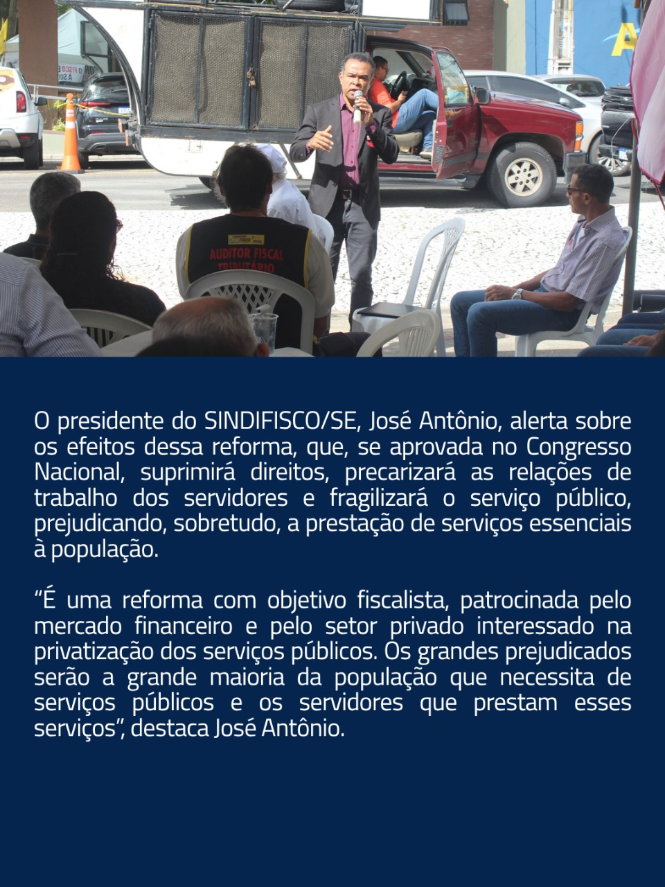 O presidente do SINDIFISCO/SE, José Antônio, alerta sobre os efeitos dessa reforma, que, se aprovada no Congresso Nacional, suprimirá direitos, precarizará as relações de trabalho dos servidores e fragilizará o serviço público, prejudicando, sobretudo, a prestação de serviços essenciais à população.