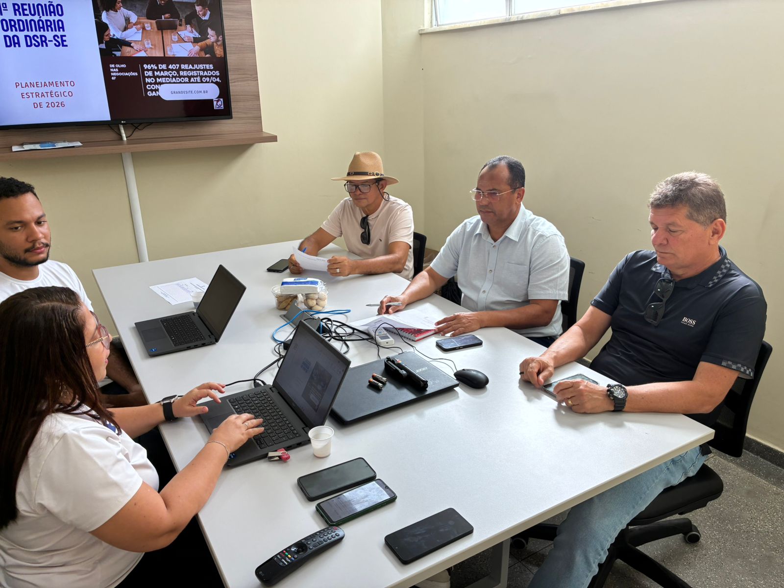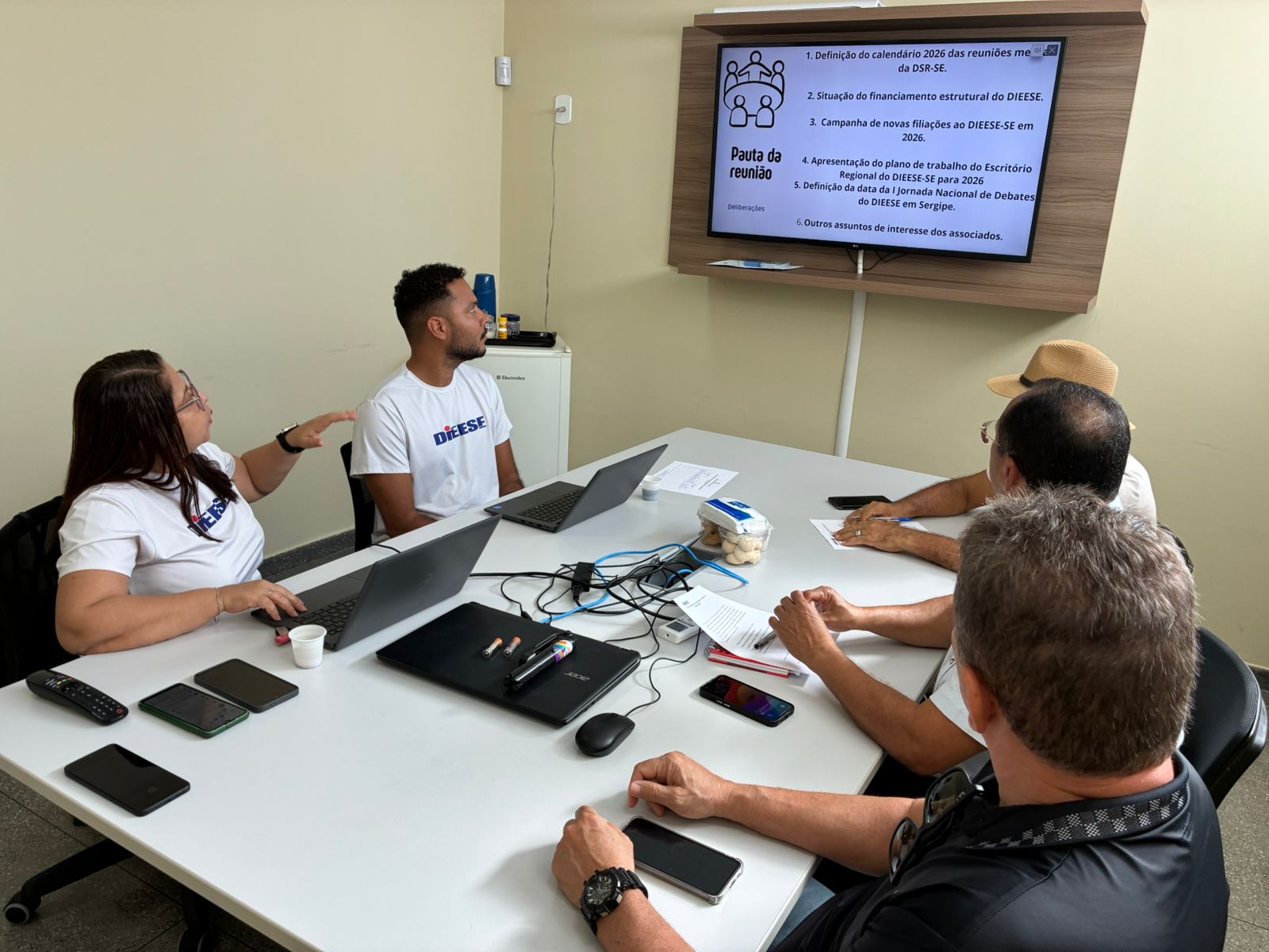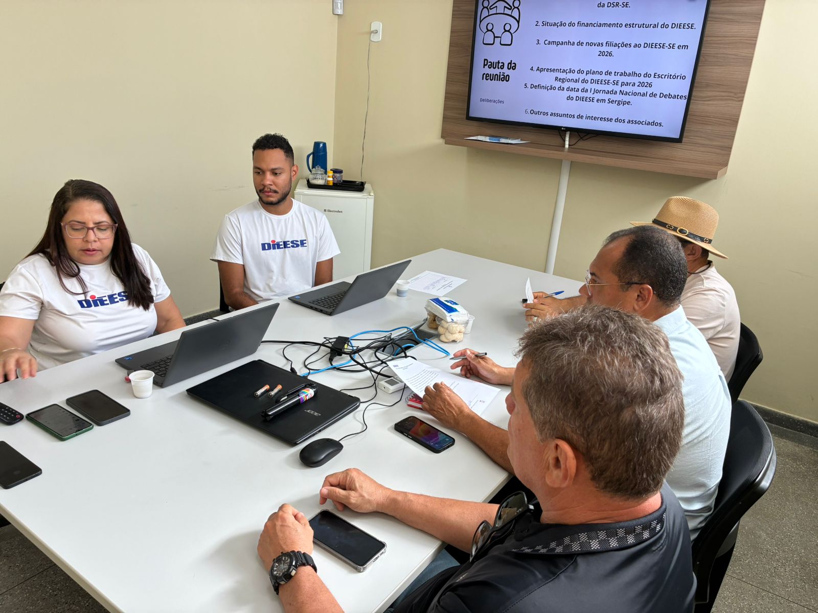 Os dirigentes sindicais que compõem a Direção Sindical Regional do Dieese/SE (DSR/SE) reuniram-se no último dia 24 de abril para deliberar sobre o calendário de atividades de 2026. A pauta incluiu ainda temas financeiros e estratégias para a campanha de filiação de novos sindicatos, visando ampliar a receita e a representatividade do Departamento no estado.