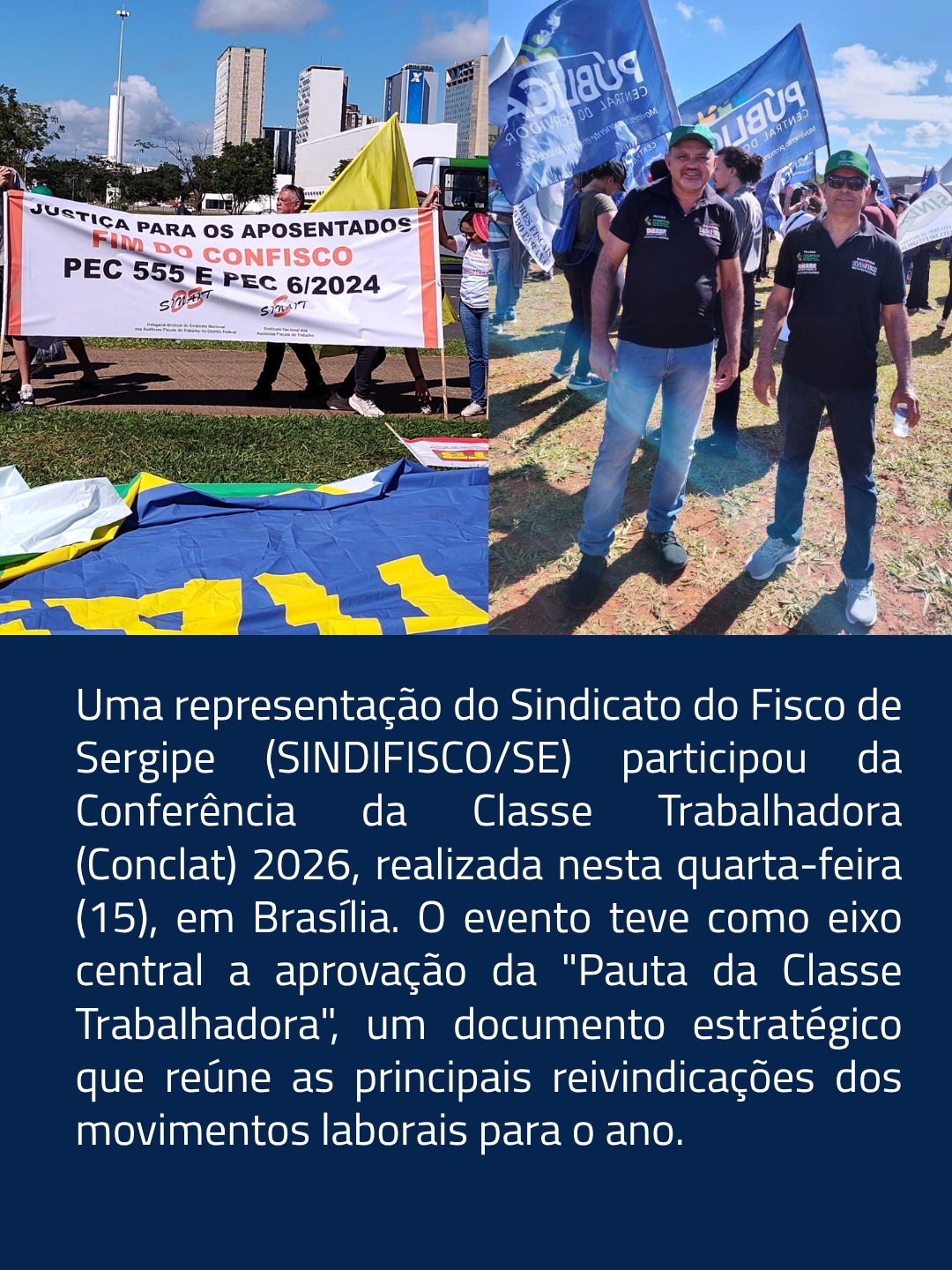 Uma representação do Sindicato do Fisco de Sergipe (SINDIFISCO/SE) participou da Conferência da Classe Trabalhadora (Conclat) 2026, realizada nessa quarta-feira (15), em Brasília. O evento teve como eixo central a aprovação da "Pauta da Classe Trabalhadora", um documento estratégico que reúne as principais reivindicações dos movimentos laborais para o ano.